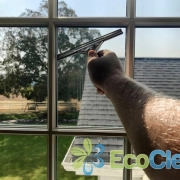 We also have another method which involves ultra pure water. Using our water purification system we remove all the minerals from the water. Then we send a constant stream of water through a hose and through an extremely light weight carbon fiber pole. At the end of this pole is a brush that is used to agitate the glass while the pure water is continuously flushing away the dirt.